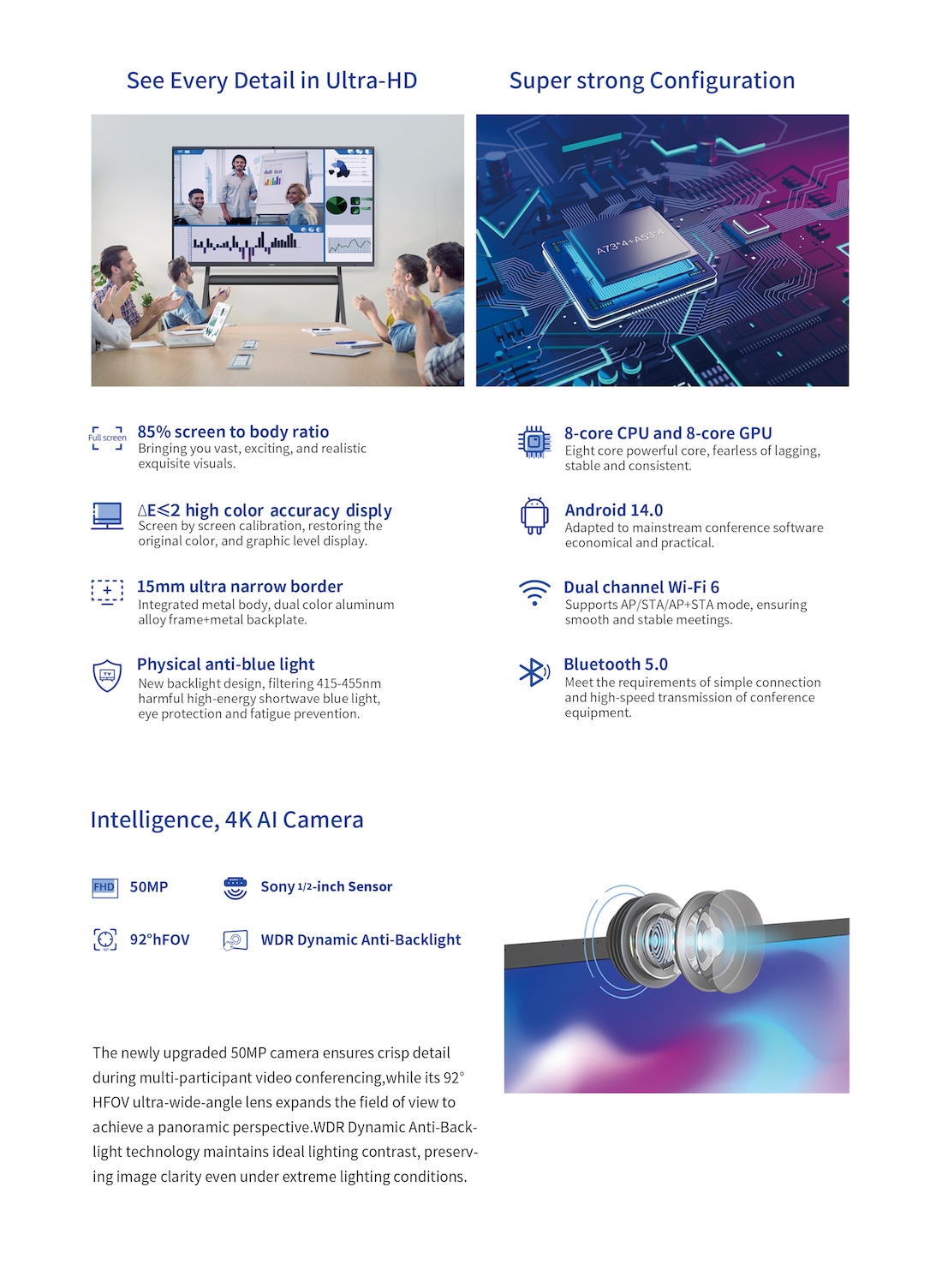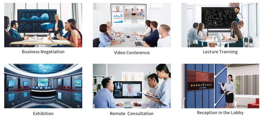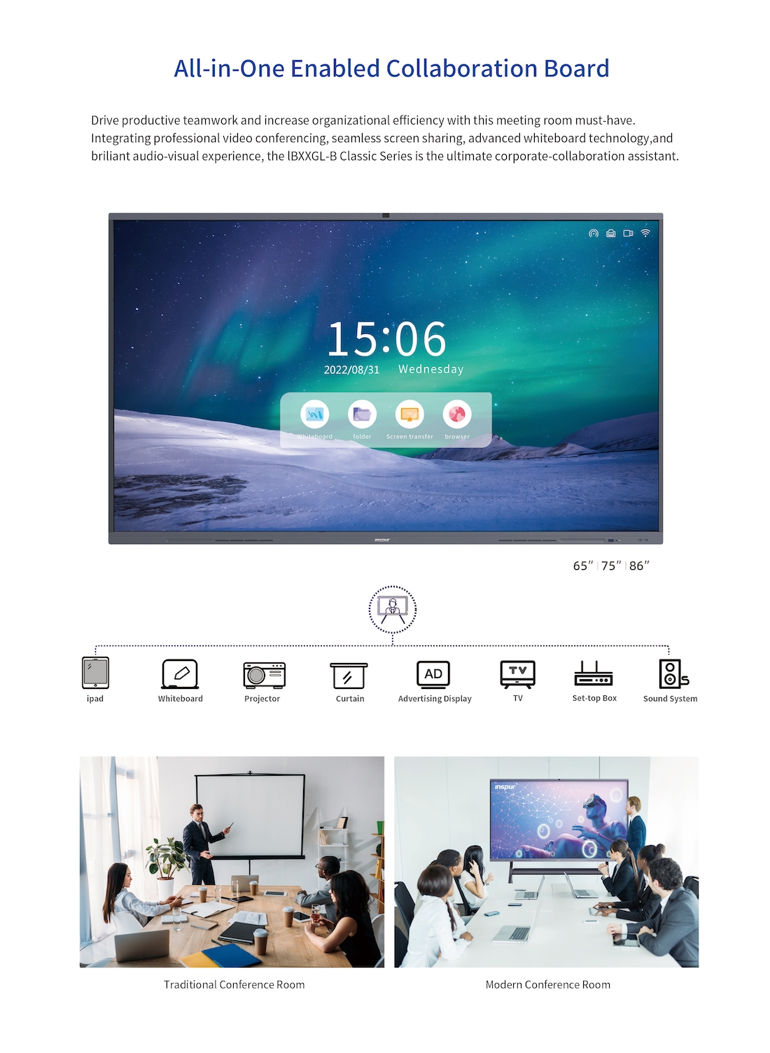 65" 75" 86" It is a new generation of highly efficient office equipment, covering functions needed for writing, presentation, and collaboration in three major conference scenarios. It liberates itself from the complexity of traditional meetings and collaboration boundaries, enabling wireless connections among terminals regardless of time and space.