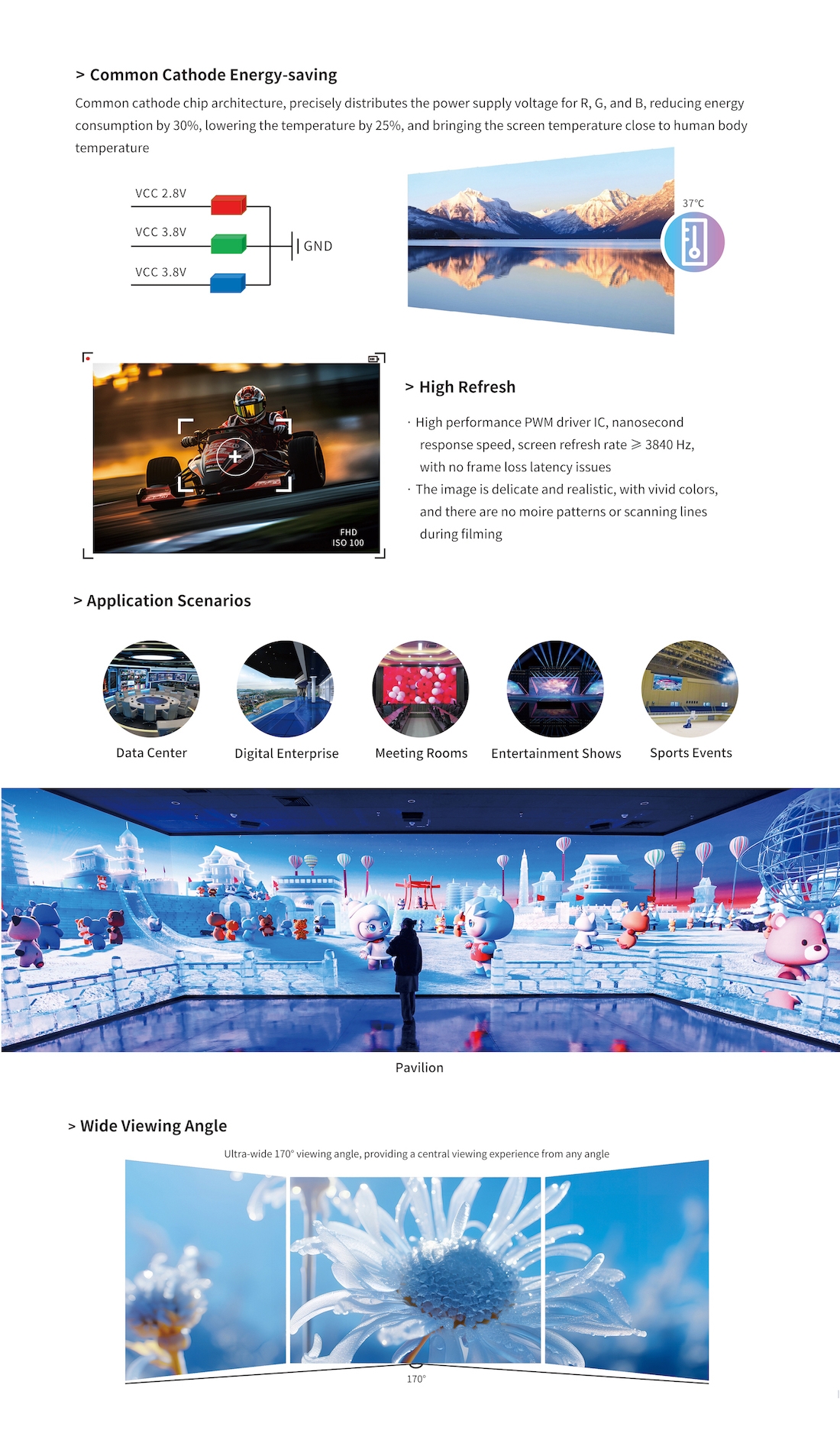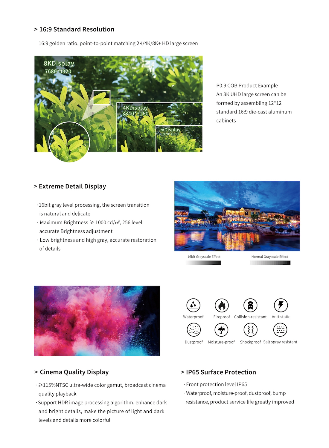 P0.7 P0.9 P1.2 P1.5 Indoor LED Display is based on the new generation of COB micro-display technology. It supports advanced HDR digital image technology, featuring ultra-large, ultra-thin, ultra-clear, ultra-bright, ultra-reliable, and ultra-protective properties. The COB small-pixel-pitch ultra-clear display is poised to become the ultimate solution for displays in the era.