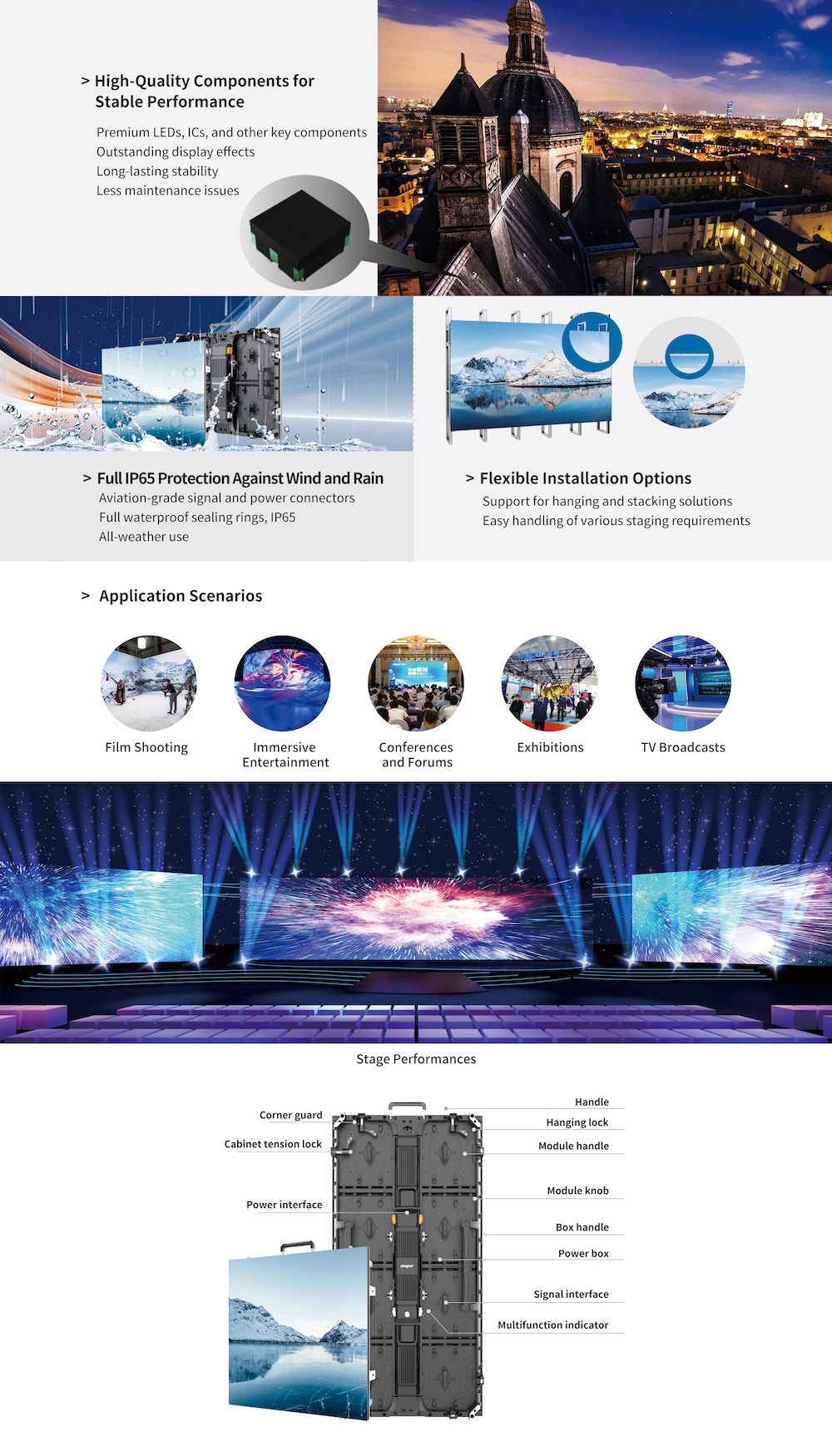 Indoor:P1.9 P2.6 P2.9 P3.9 Outdoor:P2.9 P3.9 P4.8 Rental display feature high brightness, high contrast, high refresh rate, and excellent display effects. The product is designed for rapid disassembly and assembly, with lightweight cabinets.