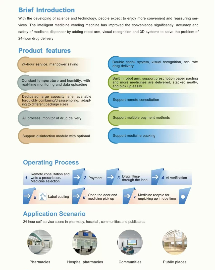 Inspur Medicine Vending Machine is particularly suited for dispensing both prescription and over-the-counter medications. Equipped with an advanced vision system for accurate drug verification and robotic technology for precise handling, it enables 24/7 automated medicine sales in clinics, pharmacies, hospital pharmacies and communities. Integrated big data management further enhances operational efficiency, effectively reducing labor costs and meeting diverse unattended retail needs.