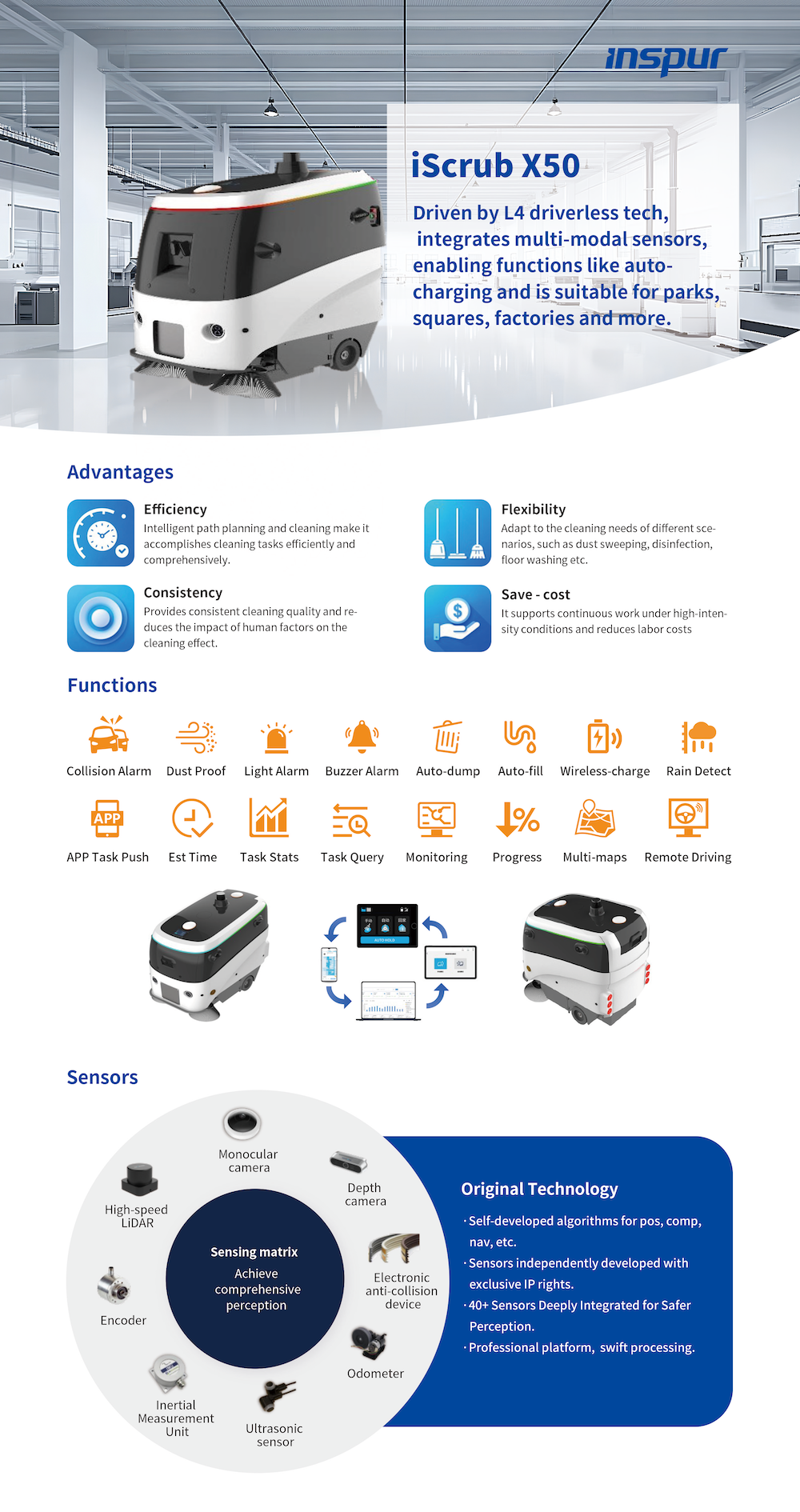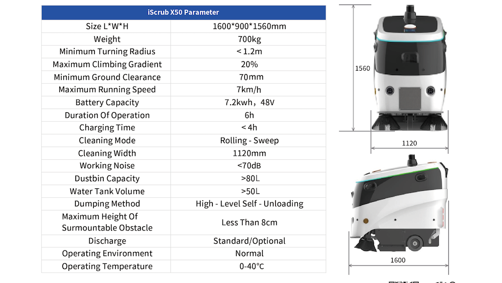 iScrub X50 Autonomous Sweeper is an L4 self-driving sweeper that integrates multi-modal sensors (vision, ultrasonic, LiDAR) to deliver fully autonomous operation, intelligent obstacle avoidance, automatic wireless charging, and automatic waste disposal. Designed for parks, plazas, industrial parks, parking facilities, and large production plants, its roller-brush system ensures efficient cleaning across diverse environments.