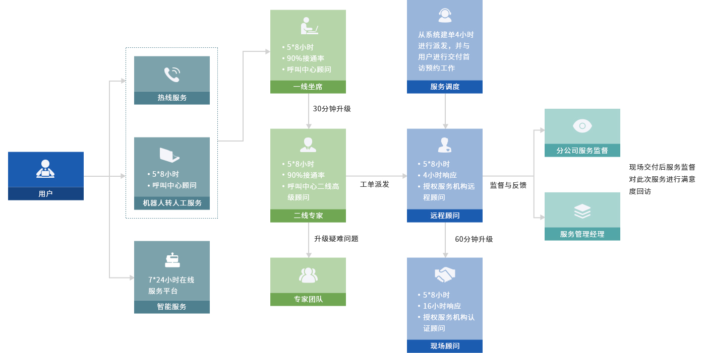 通过统一的服务资源调度,依托雄厚的技术实力,集中浪潮海岳全国优质服务资源,专家级工程师及与产品研发部门紧密衔接,迅速专业响应客户服务请求,实现高质量的服务保障;并通过严密的监控、质控、SLA度量机制确保客户服务满意,使客户可以更好的使用浪潮海岳软件,提升应用和业务水平,推动企业管理进步