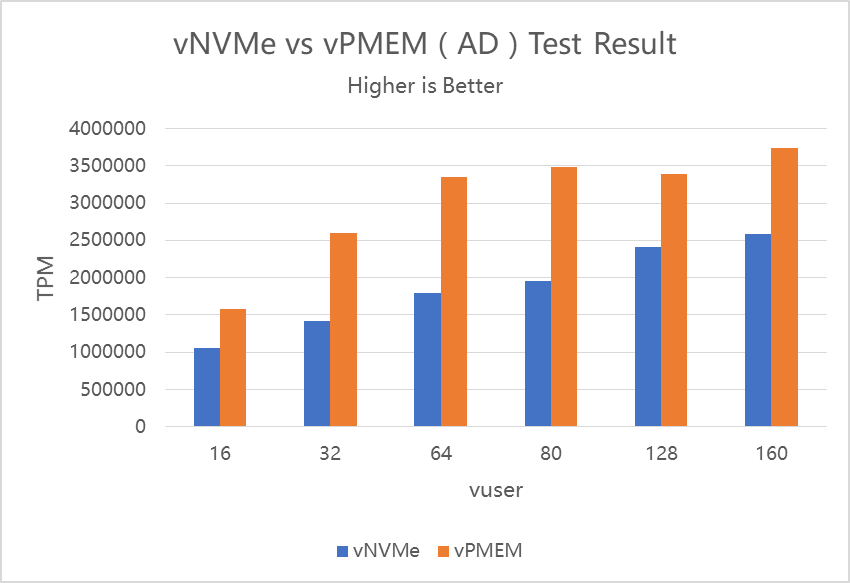vNVMe、vPMEM分别作为online redo log盘,vPMEM较vNVMe性能平均提升63%。