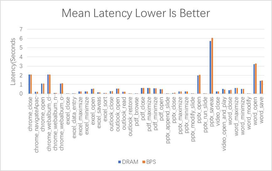 从测试结果可以看出,在标准测试用例下,英特尔® 傲腾™ 持久内存的CPU、I/O、应用延时与DRAM基本相当,都满足VDI性能要求。(表3、图3)。