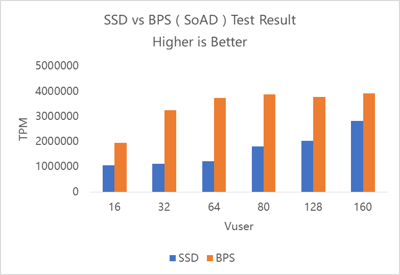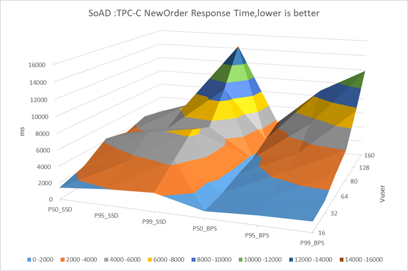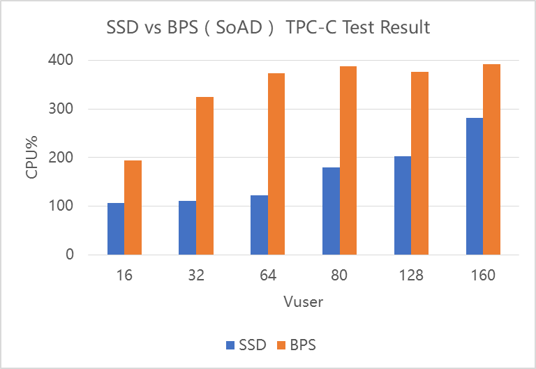 在该OLTP测试中,性能瓶颈主要在于磁盘I/O。SoAD模式下,SSD、PMem分别作为redo盘的测试对比中,TPM性能BPS方案平均是SSD的2.2倍;CPU使用方面BPS方案平均是SSD 2.65倍,性能提升与CPU使用增长基本一致。