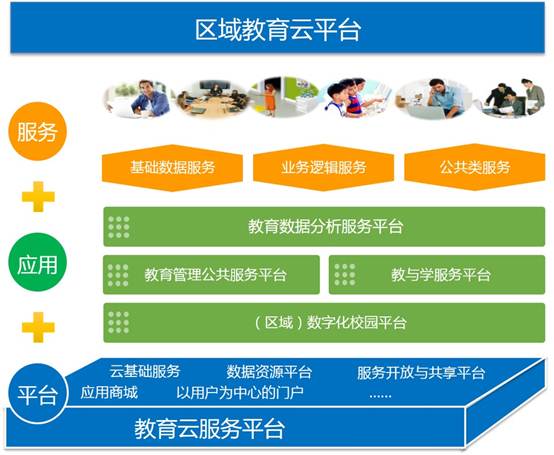 构建在教育云基础平台(IaaS)和教育云公共软件平台(PaaS)之上,包括:教育管理公共服务平台、教育资源公共服务平台、数字化教与学平台及向社会公众提供的社会公众服务平台,通过教育云应用软件平台实现了管理系统与资源平台的整合,实现了“优质教学资源班班通”和“网络学习空间人人通”的落地。