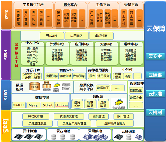 学分银行平台总体设计考虑学分银行系统服务于未来终生教育体系,与教育部整体信息化建设成果包括但不限于教育管理公共服务平台、教育资源公共服务平台等整合对接,形成一体化的国家开放大学的终生教育的信息服务体系。平台设计基于浪潮轻量级SOA的支持分布式部署的弹性支撑云应用架构平台,实现平台已有的基础模块和基于平台开发的业务模块的分布式弹性部署,充分利用云计算IAAS平台的统一管理的资源池,做到所需分配,适应各应用模块的横向扩充,灵活应对解决业务量、数据量持续增大带来的资源不足的问题。