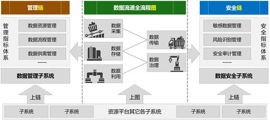“一图”是根据数据采集、数据传输、数据存储、数据交换、数据使用等各个业务过程建立起的大数据流向图,通过该流向各个节点来配套相应的数据资源管理业务链和数据安全管理业务链,即“两链”。