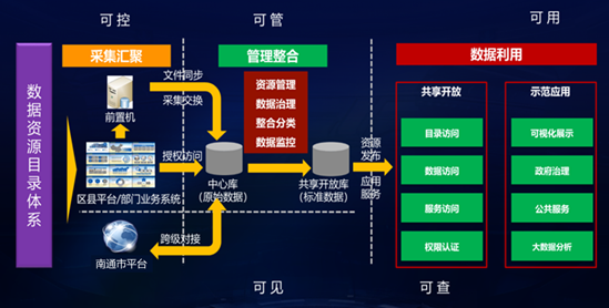 在采集汇聚环节,重点考虑依托国家标准建立的数据目录体系,通过前置机、接口调用、文件交换等多种方式,实现跨平台、跨网络的数据采集实施,同时要考虑与南通市平台的跨层级对接业务实现。