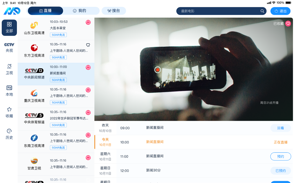 • 终端应用在5GNR广播基站信号覆盖范围内优先通过5GNR广播播放直播节目的功能。同时为保证用户观看体验,在5GNR广播不可用、且双向网链接正常的情况下,终端允许用户通过双向网络接收观看直播节目。