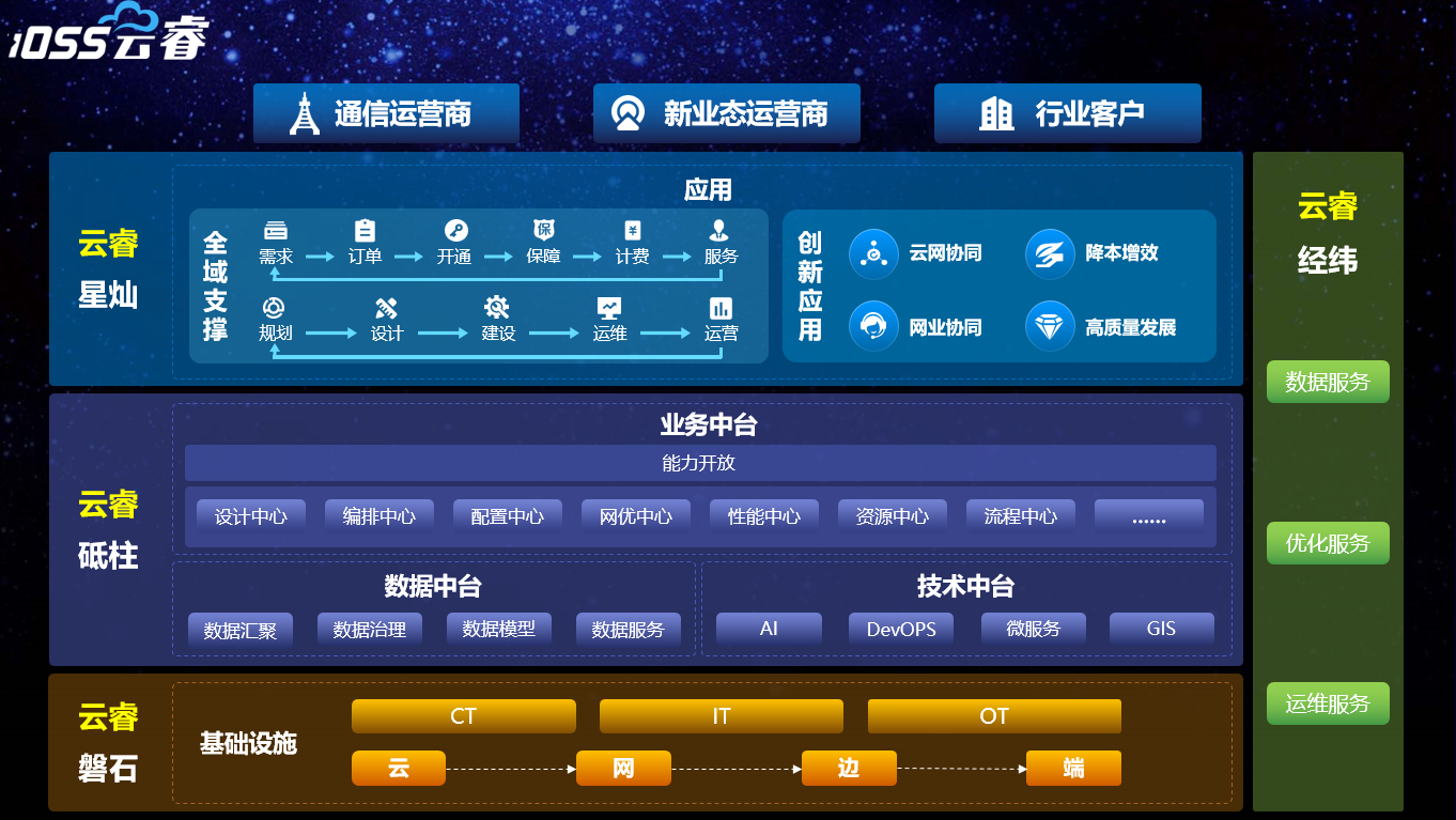 浪潮iOSS云睿包括4大方向,涵盖通信运营商所需要的核心场景和能力:云睿磐石、云睿砥柱、云睿星灿、云睿经纬。