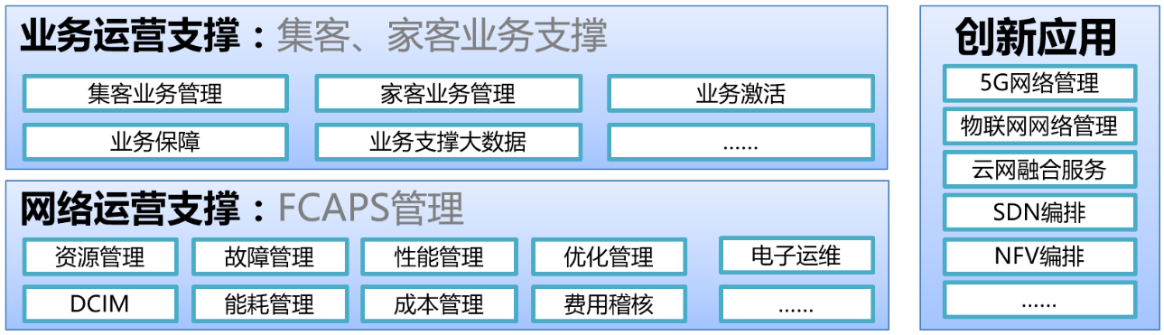 实现对传统电信网络运营的端到端支撑,提供包括基础FCAPS能力及质效运维、电子运维、代维管理、能耗管理、指挥调度、智能运维、成本管理、费用稽核等系统能力。
