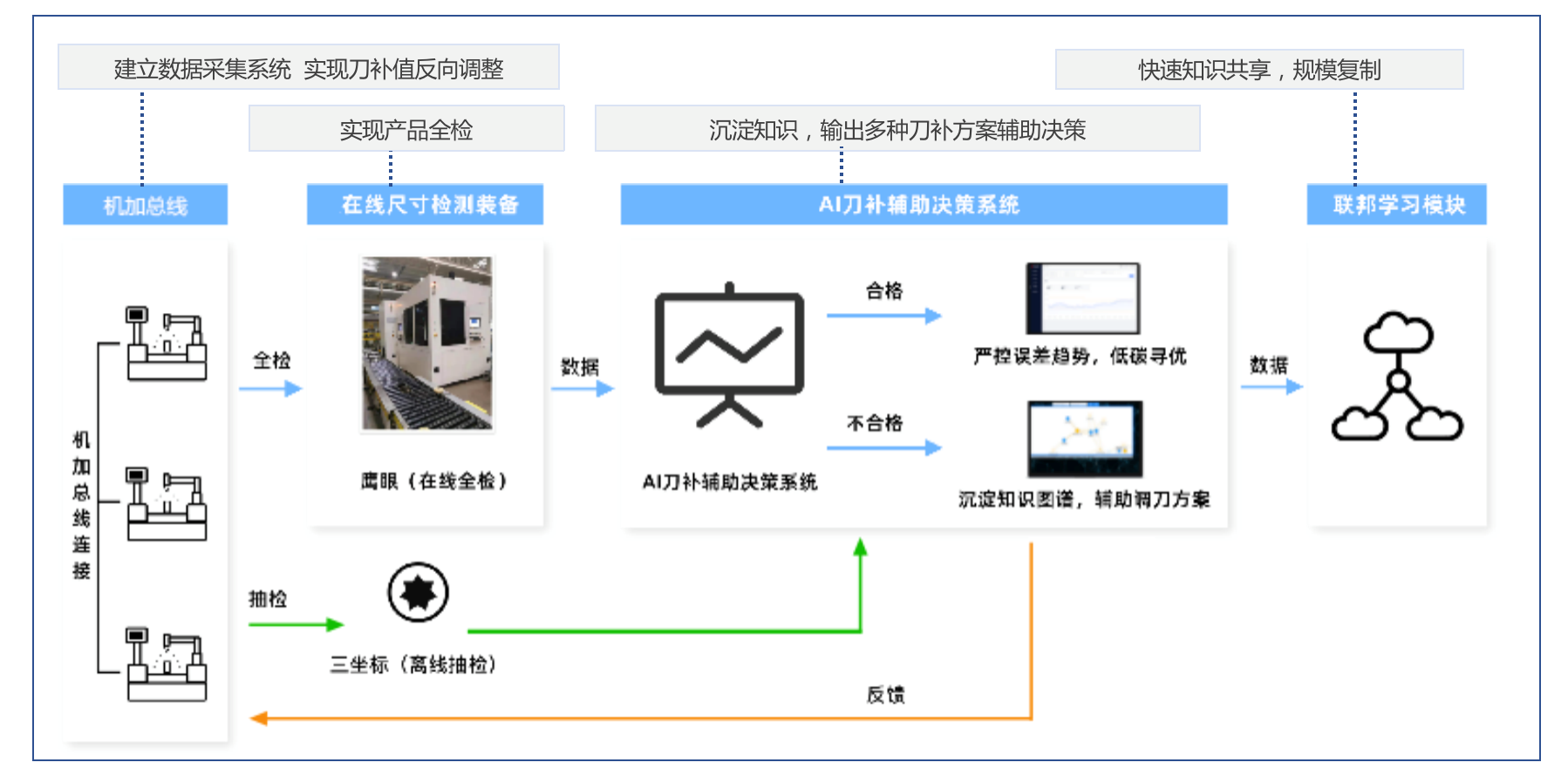 面向机械加工流程,通过机加总线、在线尺寸检测装备、AI刀补辅助决策系统、联邦学习四大模块,提升产品质量及生产效率,减少原料浪费降低成本。