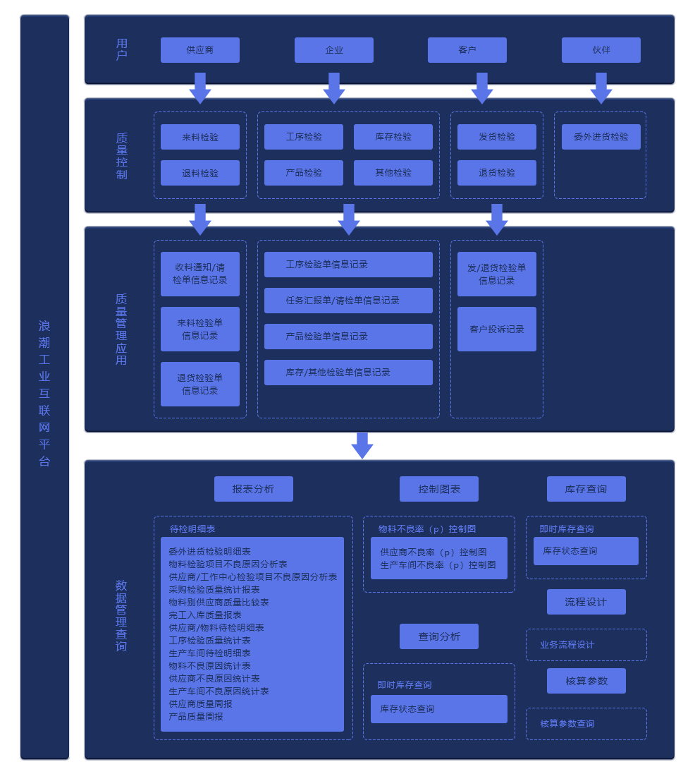 基于浪潮工业互联网平台,提供质量管理与追溯功能应用,为供应商、企业、客户、伙伴提供质量管理应用。