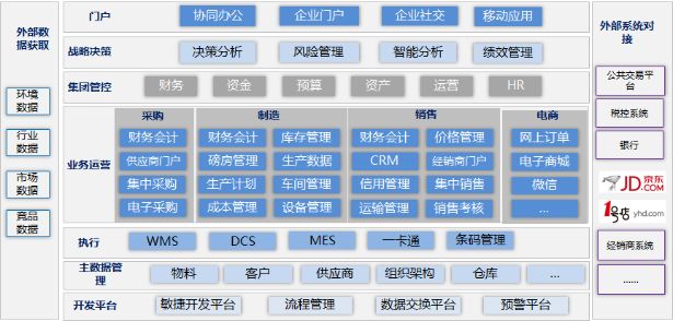 集团化管理。通过集中财务核算、集中资金管理、集中采购管理、集中销售管理、集中生产运营管理、集中人力资源管理等集团化管理手段,辅助企业集团掌握各分子公司的信息、把握各分子公司战略走向,加强分子公司协同,实现集团从上到下的全面透明管理。