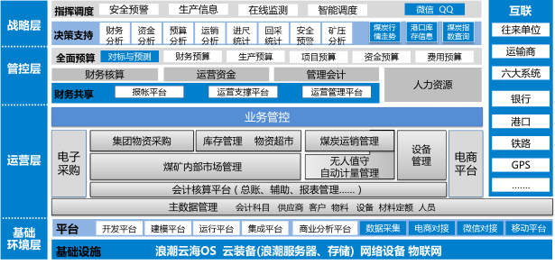 搭建集团管控信息化平台,为高层决策者建立决策支持系统,全面查询统计分析数据,以大数据思维寻找规律,为决策支持提供依据;针对集团管理,在全面预算系统的统一管控下,实现集团统一管理财务、运营资金、物资供应、煤炭运销、矿业设备等业务,构建具有煤炭行业特色的集中管控信息系统,助力煤炭企业的管理创新、降本增效,促进转型升级;实现煤矿生产经营精细化管理,通过煤矿内部市场化管理系统构建集团、煤矿、区队、班组、个人的内部市场化体系,采用阿米巴管理方式,预算、结算业务数据的一体化控制,进行煤炭生产过程价值链管理,降低生产成本。