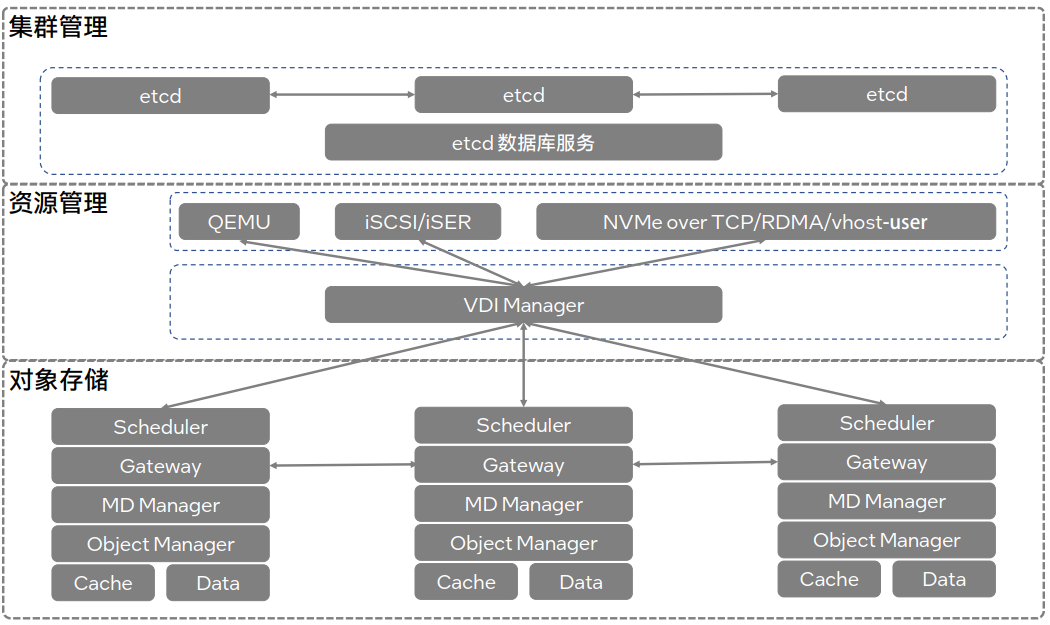 作为新一代超融合解决方案,浪潮云海® 超融合一体机 InCloud Rail 通过软件定义的计算、存储和网络技术实现了服务器的资源池化,使整个 IT 环境比单独的物理硬件具有更高的可用性、安全性和扩展性,能够有效满足企业对于降低成本、简化管理、提高安全性和扩展性的需求,助力企业向云计算迁移核心业务,构建企业云数据中心。浪潮云海® 超融合一体机 InCloud Rail 实现了存储资源的池化和统一管理,并通过全闪存架构的软件定义存储 SmartONE 支持异构算力的融合。SmartONE 采用 etcd 组件作为集群管理,负责分布式存储的节点的关系、节点之间的元数据传递及一致性等。在资源管理方面,SmartONE 提供了 qemu、iSCSI 和NVMe-oF 的服务入口,对接 VDI 卷管理入口,对外提供存储资源。在对象存储方面,SmartONE 主要接收 VDI 的 IO 请求,根据数据分布算法调度到相关节点,根据副本策略和 EC 规则调用 Gateway 分发到分布式存储的存储节点。