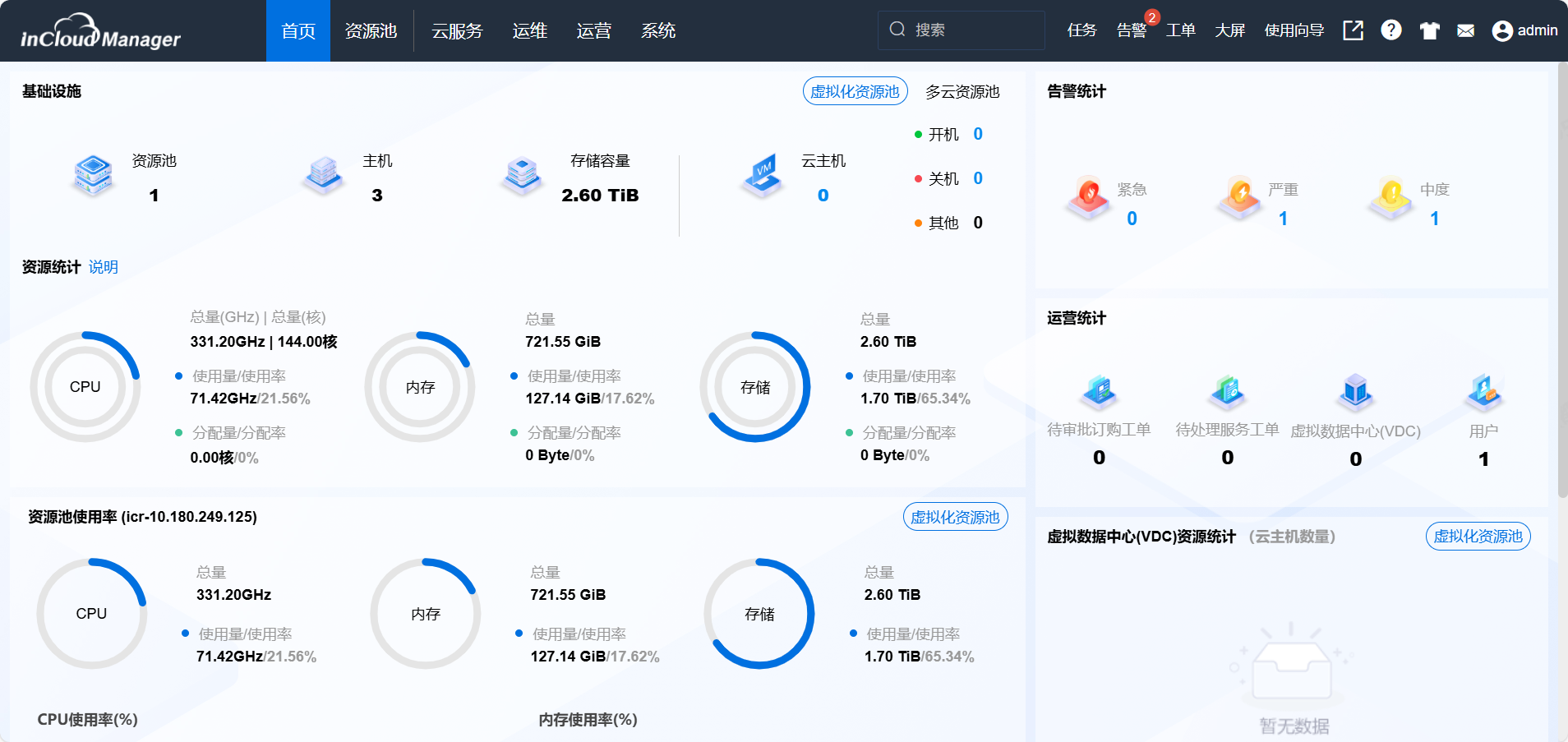 浪潮云海•云数据中心管理平台InCloud Manager 是业界功能最完善的云管理平台,针对私有云市场,提供开放的、安全的企业级云数据中心运维管理平台,融合计算、存储、网络三大物理资源成为有机整体,实现业务的动态变更,资源的智能管理和服务的自动化交付。