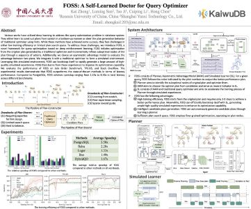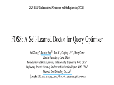 近日,KaiwuDB 与中国人民大学合作的论文 FOSS: A Self-Learned Doctor for Query Optimizer 被数据库领域顶会The 40th IEEE International Conference on Data Engineering (ICDE 2024) 录用。论文中提出了具备自学习、自诊断能力的查询优化器 FOSS,推动了基于 AI 算法的学习型查询优化技术创新发展。KaiwuDB 高级研发工程师、人大信息学院博士孙路明为共同作者。