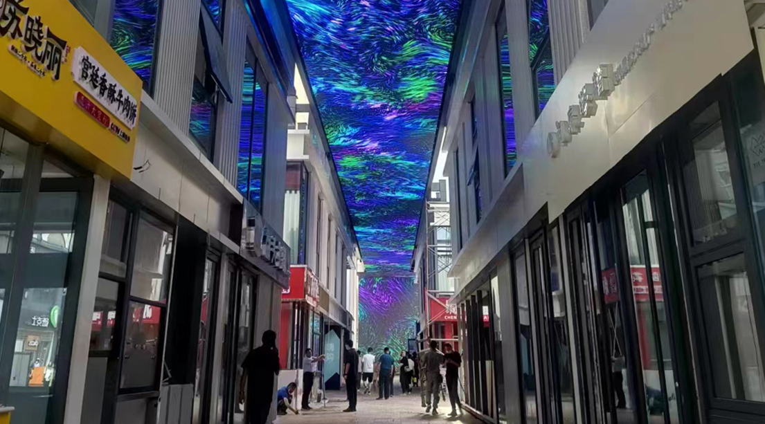 步行街天幕大屏,屏幕总长度约140 米,按街区商业通道设立,屏幕可以整体播放画面也可以分区域播放, 分区域互动,自由变换。