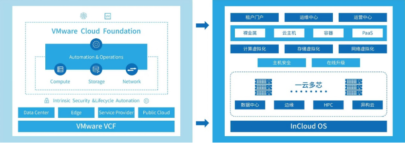 浪潮云海InCloudOS云操作系统基于一云多芯、分层解耦的设计理念,面向云计算数据中心、智能计算数据中心等新型数字化基础设施打造的可演进私有云,通过软件定义一切,融合多元算力构建统一资源池,实现对算力资源的高效管理,替代VMwareVCF并构建可演进私有云,支撑从传统IT到智能计算的全场景。